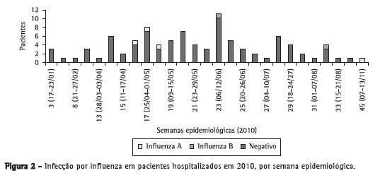 Como mostra a Figura 2, as amostras que apresentaram resultado positivo para influenza A haviam sido coletadas durante a 16ª, 17ª e 18ª semanas epidemiológicas (18-24 de abril, 25 de abril-1º de maio e 2-8 de maio, respectivamente) - todas confirmadas como representantes de infecção pelo vírus influenza A/Califórnia/04/2009 (H1N1) - e uma havia sido coletada durante a 45ª semana epidemiológica (7-13 de novembro), sendo confirmada como representante de infecção pelo vírus da influenza sazonal. As amostras positivas para influenza B haviam sido coletadas na 23ª e 33ª semanas epidemiológicas (6-12 de junho e 8-14 de agosto, respectivamente).