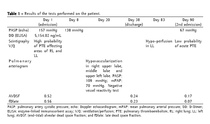 Treated with oxygen therapy, low molecular weight heparin and sildenafil (75 mg/day), the patient presented favorable evolution. After one week, a transesophageal Doppler echocardiogram revealed PASP of 138 mmHg and pulmonary artery diastolic pressure (PADP) of 58 mmHg, dilated right heart chambers and dilated pulmonary artery, thrombus in the right atrium and pericardial effusion. Twelve days after this echocardiogram was performed, pulmonary arteriography revealed a reduction in the vascularization of the upper, right middle and upper left lobes (consistent with acute or chronic PTE), PASP of 109 mmHg, mean pulmonary arterial pressure (mPAP) of 70 mmHg and absence of a response to sodium nitroprusside infusion.