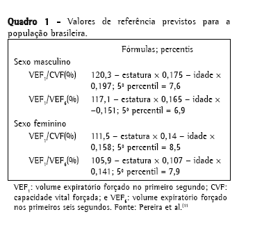 O limite inferior da relação VEF1/CVF é estabelecido subtraindo-se 7,6 e 8,5 dos valores previstos em homens e mulheres, respectivamente, na população brasileira.(11) Foram incluídos no presente estudo casos com diferença máxima entre relação VEF1/CVF prevista e encontrada de 15 e VEF1 ≥ 60%, para incluir apenas espirometrias possivelmente normais ou com obstrução leve ao fluxo aéreo.
