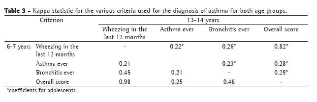 Another noteworthy finding of the present study was the confirmation that it is difficult to obtain a simple criterion for the diagnosis of asthma in a written questionnaire. The degree of concordance between the different criteria assessed was, in general, quite low (Table 3). This lack of consistency was evidenced by the great difference between the question regarding "asthma ever" and the other criteria in terms of the prevalence of asthma obtained. This same inconsistency was observed between criteria with similar prevalence, such as the questions regarding "bronchitis ever" and wheezing in the last 12 months. For both age groups, a high degree of concordance was observed only between the overall score and the question regarding wheezing in the last 12 months (Table 3), which supports the recommendation that these criteria be used for the diagnosis of asthma. It is of note that the question regarding wheezing in the last 12 months is already included in the ISAAC questionnaire, and greater concordance between this question and the overall score was therefore expected. However, the question regarding wheezing in the last 12 months does not necessarily indicate a positive or a negative overall score. This question accounts for only one third (or two fifths) of the overall score. The overall score allows the diagnosis of asthma in children with more uncommon presentations, in which wheezing is not so evident or easily identified.