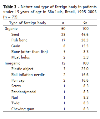 In order to profile the clinical, radiological and endoscopic characteristics of FBA in patients treated at a public referral clinic in the city of São Luís, located in the state of Maranhão, Brazil, a descriptive study was carried out in patients submitted to respiratory endoscopy due to FBA between 1995 and 2005.