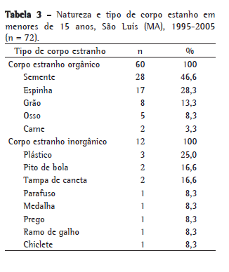 Os tipos de corpo estranho mais frequentes foram sementes (46,6%), espinha de peixe (28,3%), grãos (13,3%), osso (8,3%) e carne (3,3%), enquanto, entre os inorgânicos, foram plásticos (25%), pito de bola (16,6%) e tampa de caneta (16,6%; Tabela 3).