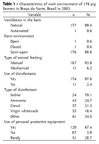 The 180 pig farmers were selected by simple random sampling. They answered a modified questionnaire to detect the presence of symptoms of respiratory diseases and were submitted to spirometry (spirometer Beatrice - AT version 4.y 2000, with flow-volume curve; EBEM, Recife, Brazil), according to standardized criteria.(13)