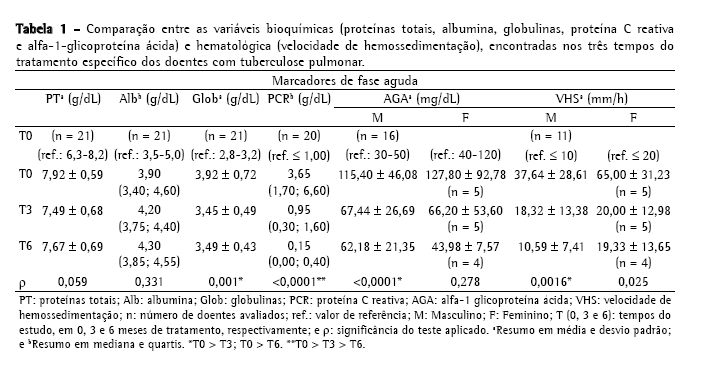 Diversos estudos têm demonstrado a existência de forte RFA em pacientes com TBP pela elevação na concentração plasmática da PCR e do VHS.(14,15) No presente estudo, também foram encontrados níveis iniciais de PCR, AGA e VHS acima dos ref., indicando uma possível utilização desses como marcadores auxiliares no diagnóstico presuntivo da doença, nos casos que apresentarem baciloscopia negativa e com quadro clínico-epidemiológico sugestivo de doença em atividade, tornando mais segura a indicação do teste terapêutico.
