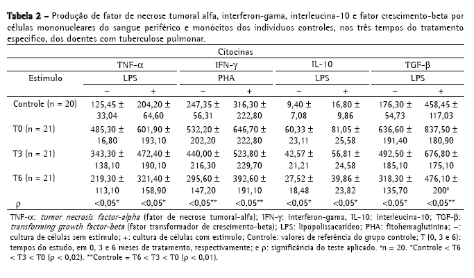 Os monócitos de pacientes com tuberculose em atividade produzem mais TGF-β do que os de indivíduos controles. O mesmo comportamento é verificado em contatos de tuberculosos e em pacientes tratados e curados de TBP.(23,29) A citocina está presente, em níveis elevados, também no líquido pleural.(18) O presente estudo está de acordo com os dados apresentados, pois foram encontrados níveis significativamente mais elevados nos doentes, com ou sem estímulo, antes, aos três meses de tratamento e ao final deste.