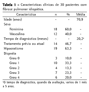 As características clínicas da amostra estão demonstradas na Tabela 1. Dos 30 pacientes avaliados, 18 eram mulheres e 12 eram homens. A média de idade foi de 70,9 anos, variando de 51 a 93 anos. Em 15 dos 30 pacientes, o diagnóstico de FPI foi confirmado pela biópsia cirúrgica a céu aberto antemortem; nos demais, o diagnóstico foi estabelecido com base nos critérios da American Thoracic Society.(1)