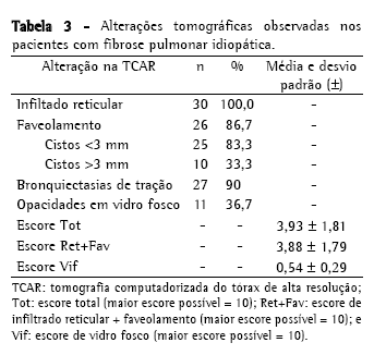 Com relação às alterações tomográficas, não observamos nódulos, áreas de aprisionamento de ar e lesões enfisematosas em nenhum dos exames, enquanto infiltrado reticular e faveolamento foram detectados em 30 e 26 casos, respectivamente. As opacidades em vidro fosco foram notadas em apenas 11 casos (36,7% da amostra) e, em todos eles, as áreas eram pouco extensas. A Tabela 3 mostra os principais achados tomográficos detectados nesse grupo de pacientes, assim como os valores das médias dos escores.