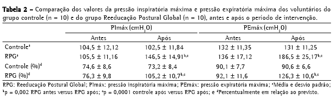 Verifica-se na Tabela 2 que os valores absolutos e relativos em relação ao predito da PImáx e PEmáx do grupo controle, obtidos antes e após o período de intervenção, não apresentaram diferença significativa. Para o grupo RPG, constataram-se valores significativamente maiores após o treinamento.