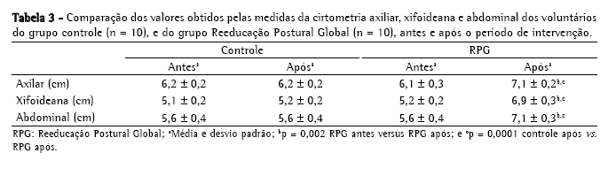 Na Tabela 3 estão apresentados os valores da cirtometria toracoabdominal, onde se observa que não houve diferença significativa para o grupo controle e que houve aumento significativo dos valores do grupo RPG quando comparadas as condições antes e após a intervenção fisioterapêutica.