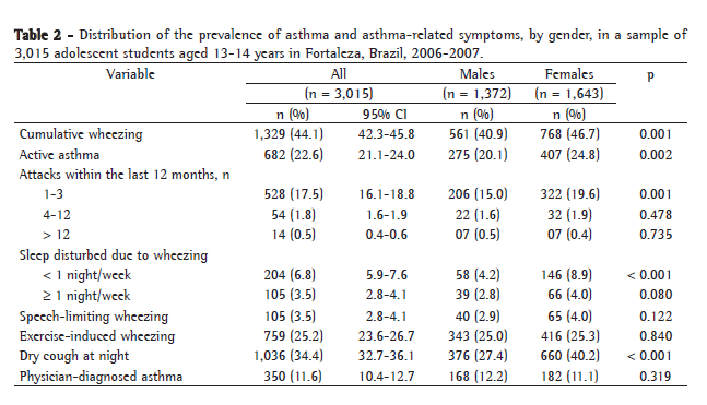 Table 2 shows that females predominated for cumulative wheezing (p = 0.001), active asthma (p = 0.002), "1-3 wheezing attacks within the last 12 months" (p = 0.001), "sleep disturbed due to wheezing less than a night per week" (p < 0.001) and "dry cough at night" (p < 0.001). For the symptoms related to morbidity/severity-"4-12 wheezing attacks within the last 12 months", "more than 12 wheezing attacks within the last 12 months", "sleep disturbed due to wheezing one or more nights per week" and "speech-limiting wheezing attacks"-there were no statistically significant differences between the genders (p = 0.478, p = 0.735, p = 0.080 and p = 0.122, respectively). A relevant difference was also observed between the prevalence of active asthma (22.6%) and that of physician-diagnosed asthma (11.6%), which is suggestive of underdiagnosis of the disease.