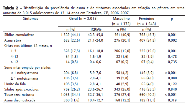 Entretanto, em algumas regiões brasileiras, ainda são poucos os estudos sobre asma realizados com essa metodologia padronizada. Em Fortaleza, CE, foi realizado, em 1998, um estudo populacional sobre a prevalência de asma e rinite entre escolares de 12-14 anos,(12) e, mais recentemente, 301 crianças atendidas em um hospital público foram inquiridas acerca de asma, sendo, nesse último estudo, utilizado o questionário ISAAC.(13) No entanto, estudos populacionais de prevalência de asma, realizados com essa metodologia, ainda não estão disponíveis em nosso estado. Buscou-se, no presente estudo, avaliar as prevalências de asma e de seus sintomas em uma amostra representativa de escolares de 13-14 anos residentes na cidade de Fortaleza, CE, utilizando-se o questionário padronizado ISAAC.