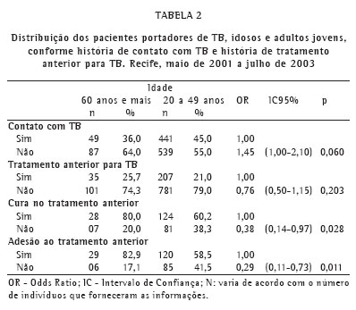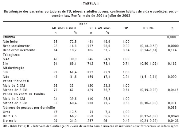 Conclui-se, portanto, que no Recife, ao se compararem indivíduos idosos e adultos jovens com TB, os idosos caracterizaram-se por apresentar: menor freqüência de etilismo e alfabetização; maior renda do chefe de suas famílias; maior aderência ao tratamento anterior; menor freqüência de tosse e dor nas costas; perda de peso mais pronunciada; menor freqüência de baciloscopias positivas para bacilo de Koch. Em relação ao desfecho do tratamento, o óbito e a cura não estiveram associados aos idosos (Tabela 5).