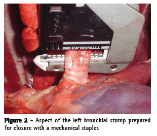 Studies comparing manual and mechanical sutures of the bronchial stump show that the latter is more resistant on post-operative day 14,(9,10) that it is more resistant from post-operative day 1 to post-operative day 14,(11-13) especially when covered with bovine pericardium and biological glue,(14) and that it presents a lower incidence of BPF.(4,6,14,15) It is accepted that, although mechanical suture is safe, easily performed, and rapid, it is not totally free of complications. However, no statistically significant difference has been found between manual mechanical sutures.(16) There are those who state that manual suture results in a lower incidence of BPF(17) and those who state that manual suture is better in general.(18)