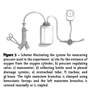 The type of animal selected, C. familiaris, is widely used in experimental studies in Brazil. It is a resistant animal, with dimensions that facilitate the surgical procedure, and it is easy to handle and obtain. Since the dogs were killed prior to surgery, there was minimal bleeding and this facilitated the entire surgical procedure. The vessels of the pulmonary hilum were easily identified, and the bronchial stump presented ideal dimensions for manual or mechanical sutures. The system used to measure the rupture pressure, which consisted of a source of compressed air or an oxygen cylinder and a manometer attached to an orotracheal tube with a system of rubber bands, was comparable to similar constructions described in other studies. In addition, the system used in this experiment had a connection with a collection bottle used in water seal pleural drainage systems. This modification makes the pressure tend to fall more slowly after the rupture of the suture line.