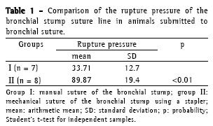 In our study, mechanical suture was found to be more resistant than manual suture. It is of note that the mean rupture pressure of the bronchial stump suture line in group II was significantly higher (p < 0.01) than that observed in group I. These results are in accordance with those obtained by various authors.(9-14) The incidence of fistulas has also been less frequent after mechanical suture,(15,16,26) although some authors have found the frequency of this complication to be higher.(17,27) The rupture pressure values obtained by various authors suggest that the process of cicatrization can have a beneficial effect on the increased resistance to pressure. The authors of three separate studies(9,10,12) obtained significantly higher rupture pressure values in animals submitted to mechanical suture and killed on post-operative day 14: 273.4 ± 37.3 mmHg, 251.25 ± 82.9 mmHg, and 251.2 ± 29.3 mmHg, respectively. The animals killed at an earlier time (on post-operative day 1) presented lower rupture pressure values: approximately 60 mmHg.(12) In the present study, the rupture pressure value was determined immediately after the suture of the bronchial stump and was found to be 89.87 ± 19.4 mmHg.