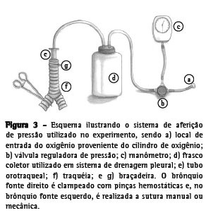 O animal selecionado, Canis familiaris, é amplamente utilizado em nosso meio para estudos experimentais. É um animal resistente, com dimensões que facilitam o procedimento cirúrgico e é de fácil manuseio e obtenção. Como o cão foi sacrificado antes da operação, o sangramento foi mínimo e isso facilitou todo o procedimento cirúrgico. Os vasos do hilo pulmonar foram facilmente identificados e o coto brônquico apresentava dimensões ideais para a sutura manual ou mecânica. O sistema utilizado para aferição da pressão de ruptura, composto por uma fonte de ar comprimido ou cilindro de oxigênio e um manômetro acoplado a um tubo orotraqueal através de um sistema de borrachas, segue uma linha semelhante de montagem em relação aos outros trabalhos. O sistema utilizado neste experimento possuía, ainda, uma conexão com um frasco coletor utilizado em sistema de drenagem pleural sob selo d'água; isso se justifica pelo fato de que a pressão tende a cair mais lentamente dessa forma após ruptura da linha de sutura.