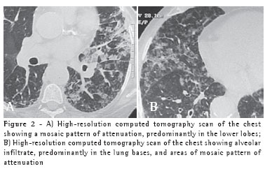 Upon physical examination, the patient presented dyspnea (+4+) at rest without cyanosis or digital clubbing. Chest auscultation revealed rales in the pulmonary bases. The cardiovascular examination was normal. The left breast was absent. The spirometry showed restrictive ventilatory defect with forced expiratory volume in one second at 55% of predicted and forced vital capacity at 47% of predicted. The patient was scheduled to undergo chemotherapy based on the suspicion of breast cancer recurrence in the form of lymphangitic carcinomatosis. The high-resolution computed tomography scan showed bilateral thickening of the interstice in the apical areas (clinical profile compatible with lymphangitis). Therefore, the extensive areas of gound-glass density, interspersed with the aforementioned interstitial thickening in a mosaic pattern of attenuation, which is not usually described for that condition, called attention to the lower lobes.