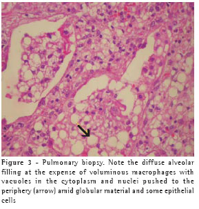 The diagnosis is suggested by the detailed clinical history and was preferentially confirmed by the finding of free lipids or lipids in the alveolar cell vacuoles in the bronchoalveolar lavage. If this is not confirmed, transbronchial or surgical biopsy becomes necessary. In the present case, bearing in mind the differential diagnosis for lymphangitic carcinomatosis and the resulting therapeutic implications, we opted for surgical biopsy involving more than one lung lobe. Occasionally, the disease is diagnosed when a pulmonary biopsy is performed for the diagnosis of community-acquired pneumonia that is refractory to antibiotic therapy.(9-10)