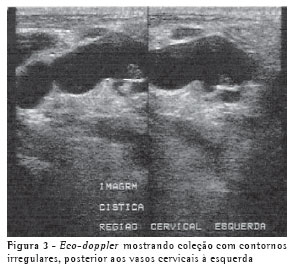 RELATO DO CASOUma mulher de 63 anos, do lar, não tabagista, previamente hígida, apresentou-se com queixa de aumento de volume em pescoço, face anterior do tórax, abdome e membros inferiores. Havia associação com dispnéia discreta aos esforços. O quadro teve início após atividade física leve em academia de ginástica, havia cinco dias. Negava doença pulmonar prévia e referia uso de fluoxetina a 20 mg/dia, bromazepam a 3 mg/dia e reposição hormonal feminina regular. Ao exame clínico observou-se um discreto aumento de volume em fossa supraclavicular esquerda e face lateral direita do pescoço. Observou-se ainda diminuição do murmúrio vesicular de forma difusa e de frêmito toracovocal em bases (direito maior que esquerdo), além de edema de parede abdominal anterior e de membros inferiores (grau I/IV). Foram solicitados hemograma, coagulograma, glicemia, creatinina, uréia, velocidade de hemossedimentação, colesterol total, HDL, triglicerídeos, T3, T4, TSH e parcial de urina, os quais se apresentaram todos normais, descartando a presença de dislipidemia, coagulopatia, infecção, nefropatia e hipotireoidismo. A avaliação radiológica do tórax revelou um pequeno derrame pleural bilateral (Figura 1), confirmado pela tomografia axial computadorizada de tórax (Figura 2A). Esta foi complementada com cortes ao nível do pescoço, que evidenciaram edema na região supraclavicular esquerda com imagem hipodensa (20 x 10 mm) adjacente ao feixe vasculonervoso do pescoço (Figura 2B). A ultra-sonografia da região cervical mostrou a formação de uma coleção cística, posteriormente aos vasos cervicais, sugestiva da ruptura do tronco jugular esquerdo. Demonstrou ainda um pequeno aumento da espessura do músculo esternocleidomastóideo esquerdo, sugestivo de processo inflamatório secundário a distensão muscular (Figura 3). A paciente foi submetida a toracocentese diagnóstica à direita com obtenção de líquido leitoso compatível com QT. A análise laboratorial demonstrou tratar-se de um exsudato com predomínio de polimorfonucleares e com dosagem de triglicerídeos de 2.035 mg/dl, colesterol de 131 mg/dl e proteínas de 9,7 g/dl, confirmando o quadro laboratorial de QT. Foram realizadas citologia oncótica, bacterioscopia de Ziehl, micológico direto e culturas, que resultaram negativos, descartando processos malignos e doenças infecciosas.