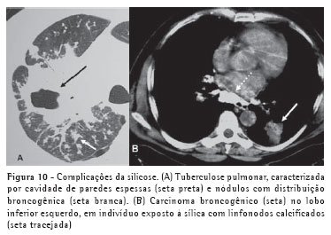 Os métodos de imagem também são muito úteis na avaliação de complicações da silicose, como a tuberculose pulmonar (silicotuberculose), infecções fúngicas e neoplasias pulmonares (Figura 10).