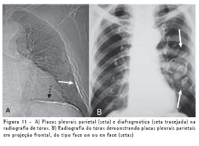 Placas pleuraisAs placas pleurais são a manifestação mais comum da exposição ao asbesto, sendo consideradas marcadores de exposição. Envolvem mais comumente as porções posteriores e laterais da pleura da parede torácica, entre a sexta e a décima costelas, e a pleura diafragmática, principalmente na sua porção superior. A maior parte ocorre na ausência de asbestose e raramente detecta-se asbestose quando placas pleurais não estão presentes. A radiografia do tórax é até hoje o método de imagem mais utilizado na avaliação das placas pleurais (Figura 11).(8-9)