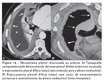 MesoteliomaApesar de haver descrições de mesotelioma em indivíduos com inflamação pleural crônica ou com história de exposição a carcinógenos químicos, a exposição ao asbesto está associada ao desenvolvimento do tumor em 50% a 80% dos casos. Dentre os achados radiológicos, o derrame pleural, geralmente unilateral, é o mais comum.