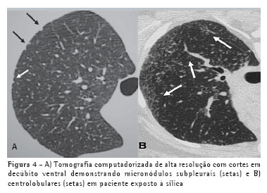 A TCAR é um método mais sensível e específico do que a radiografia simples para a detecção e caracterização da silicose. Permite melhor definição do tipo e da extensão das alterações, especialmente do enfisema centrolobular que pode estar presente nestes indivíduos e que é dificilmente demonstrado pela radiografia, a não ser nos casos mais acentuados. A concordância inter e intraobservador na avaliação das alterações respiratórias decorrentes da silicose é maior com a TCAR do que com a radiografia e a correlação com a função pulmonar é mais fidedigna com a TCAR. Em um estudo realizado num grupo exposto à sílica com radiografias normais, a TC estava alterada em 41% dos casos, sendo que em 10% as alterações eram visíveis apenas com a TCAR.(4) Nos indivíduos com radiografias alteradas, neste mesmo grupo, a TCAR permitiu melhor caracterização dos achados. Por estes motivos, segundo alguns autores, a TC deve ser realizada sistematicamente naqueles indivíduos expostos com suspeita de silicose na radiografia simples de tórax.