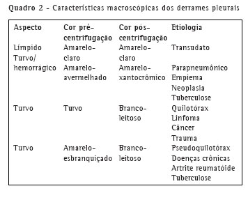 Nestes casos, após a centrifugação, o sobrenadante do líquido pleural clareia, diminuindo o aspecto turvo observado durante a punção. Caso a turbidez persista após a centrifugação, o diagnóstico a ser considerado é quilotórax e/ou pseudoquilotórax. A observação de um derrame pleural quiloso sugere a presença de linfoma, carcinoma ou etiologia traumática. Em muitas situações o trauma é iatrogênico, como no pós-operatório de cirurgia cardiovascular ou de esôfago e nas grandes dissecações do mediastino. O pseudoquilotórax é mais freqüentemente observado em derrames pleurais crônicos, como aqueles que ocorrem na artrite reumatóide e na tuberculose (Quadro 2).(7-8)