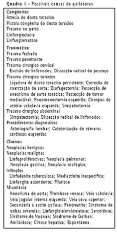 MiscelâneaPode-se observar uma gama variada de outras causas de quilotórax: infecções, filariose, pseudocisto de pâncreas, pacreatites, trombose de veias jugular e subclávia, cirrose hepática, amiloidose, tuberculose, entre outras (Quadro 1).