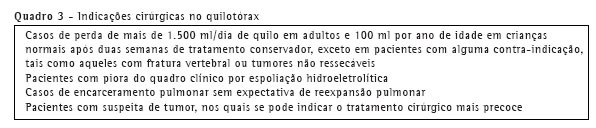 haja uma rápida redução no débito dos drenos torácicos. Assim como comentado anteriormente para o tratamento conservador, administra-se uma refeição hipergordurosa antes da remoção do dreno. Isto permite que se tenha certeza de que a fístula do ducto torácico está fechada. Se não houver aumento do volume de secreção após esta manobra, o tratamento cirúrgico obteve êxito.