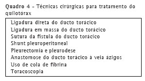Existem diversas modalidades de tratamento do quilotórax (Quadro2).(9-12)
