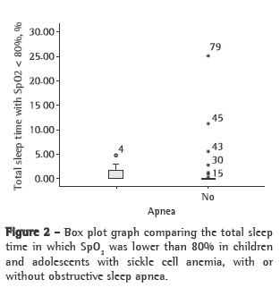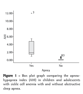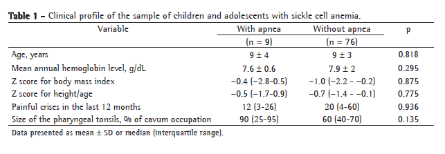 There have been few studies describing the overlap between obstructive sleep apnea syndrome (OSAS) and sickle cell anemia (SCA). Therefore, the exact prevalence, etiology and natural history of OSAS in patients with SCA has yet to be defined.(1) It is known that OSAS is associated with hypoxemia, hypercapnia and acidosis, which might induce the polymerization of hemoglobin S (Hb S), the potentiation of the sickling process and the onset of vaso-occlusive crises.(2) In addition, approximately 80% of children with SCA present nocturnal desaturation, which might be the result of OSAS.(3)