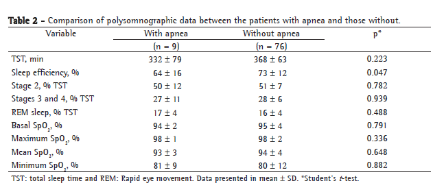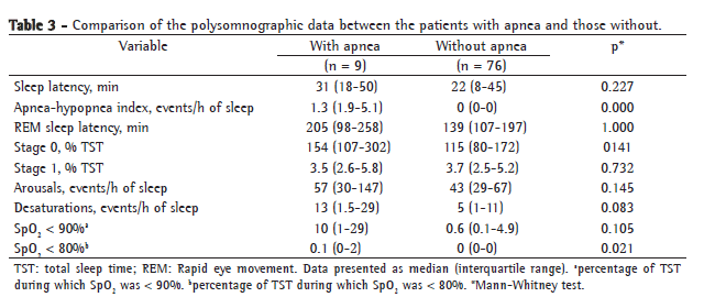 Polysomnography was conducted during spontaneous sleep; no sedation or sleep deprivation was used, and stimulating foods and beverages (coffee, chocolate, soda and black tea) were avoided. Polysomnography was carried out in a hospital environment, using the computerized Sonolab 620 device (Medtron, São Paulo, Brazil). All results were issued by the same observer.
