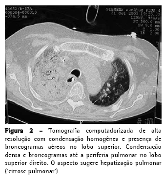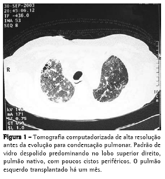 Homem, 56 anos, com diagnóstico de FPI (clínicofuncional-tomográfico-patológico) há cinco anos, evoluiu progressivamente com dispnéia a mínimos esforços e tosse mucóide escassa, intensa e de difícil controle. Apresentava, no mês do transplante pulmonar, hipoxemia e hipercapnia (PaO2 57 mmHg e pressão parcial de dióxido de carbono no sangue arterial 45 mmHg, em repouso e no ar ambiente ao nível do mar), DCO 29% do previsto, capacidade vital forçada 40,8% (1,41 L) e o volume expiratório forçado no primeiro segundo 52,6% (1,31 L). A cintilografia perfusional pulmonar demonstrava fluxo arterial de 76,7% para o pulmão direito e 23,3%, para o pulmão esquerdo. Os exames laboratoriais para o diagnóstico de doenças do colágeno e o inquérito epidemiológico para as doenças intersticiais conhecidas foram negativos. Durante os cinco anos de acompanhamento, tinha utilizado corticosteróides (prednisona 0,25 a 1 mg/kg/dia), imunossupressores (azatioprina ou ciclofosfamida 0,5 a 2 mg/kg/dia) e antifibrótico/imunomodulador (interferon-.1b) por quatro meses. O transplante foi unilateral à esquerda, correspondendo à menor perfusão arterial e maior intensidade do acometimento do interstício pela tomografia computadorizada de alta resolução (TCAR). No pós-operatório imediato evoluiu com instabilidade torácica devido à fratura de três arcos costais, em decorrência da tração de costelas osteopênicas durante o fechamento da ferida cirúrgica, e com isquemia de reperfusão pulmonar grave (relação PaO2/fração inspirada de oxigênio = 124). Permaneceu em ventilação mecânica (VM) invasiva por dez dias, traqueostomizado, e recuperando-se progressivamente da hipoxemia. O esquema de imunossupressão iniciado foi composto pela ciclosporina 5 mg/kg de 12/12 h, prednisona 0,5 mg/ kg/dia e azatioprina 2 mg/kg/dia, além do anticorpo anti-receptor da interleucina-2 basiliximab no 1º e 4º dias pós-operatório e da metilprednisolona 1 g no pré-operatório. Obteve alta da unidade de terapia intensiva para o quarto da unidade semi-intensiva, mas no 8º dia na unidade semiintensiva houve exacerbação da dispnéia, associada ao retorno da tosse seca e de progressiva estertoração crepitante em todo o hemitórax direito, sendo re-encaminhado para a unidade de terapia intensiva. Uma nova avaliação foi feita através de TCAR, broncofibroscopia com lavado broncoalveolar (LBA) e biópsia transbrônquica do lobo inferior esquerdo e do lobo superior direito. Todas as culturas foram negativas, o LBA tinha padrão neutrofílico, sem eosinófilos ou macrófagos com hemossiderina, e o histopatológico não foi conclusivo. Foi realizada arteriografia pulmonar e, posteriormente, vídeotoracoscopia com biópsia pulmonar em três diferentes regiões do lobo superior direito para assegurar a representatividade da doença (Figuras 1 e 2). A arteriografia não demonstrava doença tromboembólica.
