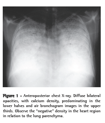 Upon physical examination, the patient presented tachycardia, tachypnea, pallor and cyanosis (central and peripheral). Arterial oxygen saturation was 80%, without the use of supplemental oxygen. Pulmonary auscultation revealed reduced breath sounds throughout, with fine crackles in the lower thirds and in the anterior region of both hemithoraces. She presented digital clubbing. Routine chest X-ray revealed pronounced bilateral diffuse pulmonary infiltrate, with calcium density (Figure 1). High-resolution computed tomography (HRCT) revealed diffusely distributed calcified micronodules, with calcifications in the pleural space and the interlobular septa (Figure 2). Transthoracic echocardiogram was performed, revealing mild pulmonary hypertension, with a pulmonary artery systolic pressure of 43 mmHg and an ejection fraction of 58%. A diagnosis of PAM was therefore established. After stabilization of the acute status, the patient was discharged and instructed to use oxygen at home-­1 L­/­min. Ten months after diagnosis, the patient was rehospitalized at 28 weeks and 2 days of pregnancy, with worsening of the cyanosis and dyspnea. She was admitted to the hospital, and oxygen therapy by nasal catheter was initiated (5 L/­min). The blood gas analysis results were as follows: pH, 7.34; arterial carbon dioxide tension, 43 mmHg; arterial oxygen tension, 49 mmHg; arterial oxygen saturation, 81%; and bicarbonate, 22.7 mEq/L. After stabilization of hypoxemia, using a Venturi mask at 35%, and improvement of dyspnea, the patient was transferred to the high risk prenatal clinic of the Assis Chateubriand Maternity Teaching Hospital. The patient remained hospitalized throughout pregnancy, with nasal oxygen administration (1 L/­min) and oxygen saturation of approximately 94%. After 32 weeks and days of gestation, she underwent cesarean section. During the procedure, she remained in use of the Venturi mask at 50%, without hypoxia. The newborn was responsive, crying at birth, with hydrated and normotensive fontanelle, weighting 1,960 g, measuring 42 cm, with a cephalic perimeter of 31.5 cm and a thoracic perimeter of 28.5 cm, all of which are appropriate for the gestational age, presenting zone III jaundice and a favorable response to phototherapy. The one-minute Apgar score was 8, and the two-minute Apgar score was 9. The newborn presented normal heart and lung auscultation. Reflexes were present and symmetric. Approximately 1 year and 8 months after delivery, the patient returned to the outpatient clinic bringing the child, who presented normal psychomotor development. The patient evolved with progressive worsening of the dyspnea in this period. Spirometry was performed, with the following results: forced vital capacity (FVC), 2.80 L (25.9% of predicted); forced expiratory volume in one second (FEV1), 2.59 L (13.9% of predicted); FEV1/ FVC ratio, 91.1% (75.6% of predicted); and forced expiratory flow between 25% and 75% of FVC, 3.63 L/s (65% of predicted) The patient was therefore diagnosed with severe restrictive respiratory disorder.