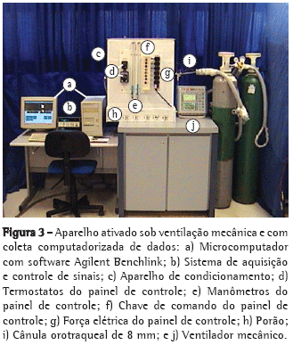 ExperimentaçãoO aparelho foi ativado e mantido em repouso até que houvesse equilíbrio térmico dentro do sistema a 37 °C. Conectou-se a cânula orotraqueal ao aparelho e iniciou-se a ventilação mecânica, que foi mantida até atingir novamente o equilíbrio térmico (Figura 3).