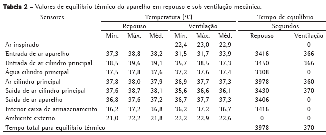Depois de atingido o equilíbrio em repouso, procedeu-se à ventilação mecânica. Inicialmente, houve uma discreta queda de 0,9 °C nas temperaturas registradas, que foi recuperada rapidamente, atingindo-se novamente o equilíbrio térmico em 370 s e entrando em estabilidade (Tabela 2).