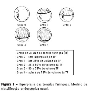 Todas as cirurgias foram realizadas na parte da manhã e pelo mesmo cirurgião. Após a indução anestésica, a rinofaringe foi avaliada para se verificar e classificar a hiperplasia da tonsila faríngea (adenóides) através de um fibronasolaringoscópio flexível Machida® (Machida Co, Japão) (Figura 1). Após a realização da cirurgia, os pacientes permaneciam um tempo mínimo de quatro horas na sala de recuperação anestésica, sendo depois liberados para a enfermaria. O volume das tonsilas palatinas foi anotado ao término do procedimento, sendo obtido através da diferença de volume de líquido após imersão das tonsilas palatinas em um frasco graduado com um volume conhecido de soro fisiológico.