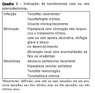 Para avaliar o efeito da adenotonsilectomia em crianças com DRS foi planejado um estudo tipo antes e após a intervenção. Os candidatos para o estudo foram selecionados entre crianças atendidas no Ambulatório de Otorrinolaringologia e Pneumologia Pediátricas do Hospital Santo Antônio, do Complexo Hospitalar Santa Casa de Porto Alegre. Todos os pacientes selecionados apresentavam indicação de tonsilectomia com ou sem adenoidectomia (Quadro 1), e foram encaminhados para tratamento por médicos pediatras da Secretaria Municipal da Saúde. Esses candidatos tiveram seus critérios de eligibilidade checados por médicos residentes que desconheciam os objetivos do estudo. Os critérios de inclusão foram: idade entre dois e dez anos e início dos sintomas obstrutivos respiratórios durante o sono havia, pelo menos, três meses. Os critérios de exclusão foram: presença de anormalidades crânio-faciais, genéticas ou neurológicas, presença de asma ou outra doença pulmonar crônica e presença de polipose nasal.