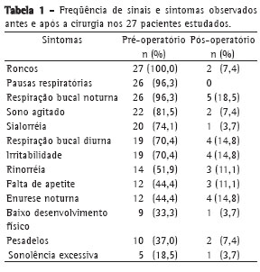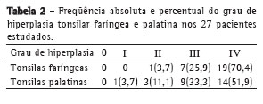 Dos 35 pacientes elegíveis para o estudo, 8 não realizaram oximetria pós-operatória e 27 completaram o estudo. A idade média foi de 5,2 ± 1,8 anos. Dezoito pacientes eram do sexo masculino (67,7%) e 22 eram da raça branca (81,5%). A maior parte dos pais ou responsáveis tinha primeiro grau incompleto (63%). As queixas clínicas mais freqüentes foram: roncos (100%), pausas respiratórias durante o sono (96,3%), respiração bucal noturna (96,3%), sono agitado (81,5%) e sialorréia (74,1%) (Tabela 1). A maioria dos pacientes apresentou hiperplasia de tonsilas faríngeas e palatinas classificadas em graus 3 ou 4 (96,3% e 85,2%, respectivamente) (Tabela 2). Seis crianças encontravam-se abaixo do percentil 25 do peso para idade (22,2%), sendo 3 do sexo masculino, e 3 crianças encontravam-se acima do percentil 75 (25,9%), sendo 2 do sexo masculino.