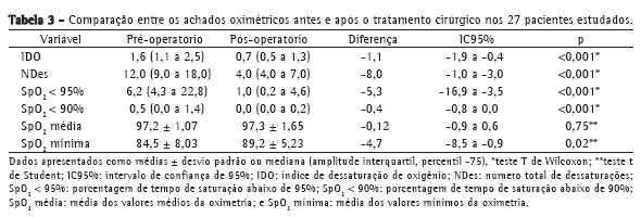 As variáveis oximétricas antes e após a cirurgia foram analisadas pelo teste t de Student ou Wilcoxon, conforme o tipo de distribuição dos dados. Para verificar a associação entre os dados antropométricos e o exame físico com os achados oximétricos pré-operatórios, foi utilizado o teste de correlação de Spearman. Os dados foram tabulados e analisados utilizando-se os programas Excel® e SPSS® versão 11.0. Os dados antropométricos foram analisados pelo programa Nutristat® do pacote Epi Info. 2002®. O tamanho amostral necessário foi estimado utilizando-se o teste t de Student para comparar a diferença entre as médias do IDO antes e depois do tratamento cirúrgico. Para o cálculo utilizou-se um estudo realizado previamente com o mesmo modelo de oxímetro utilizado em uma amostra de pacientes com características clínicas semelhantes.(9) Utilizou-se o programa Samples® do pacote estatístico PEPI® e estimou-se um erro alfa de 5% e um poder de 90%. Calculou-se um tamanho amostral mínimo de 21 pacientes com o desfecho. Este trabalho foi aprovado pelo Comitê de Ética em Pesquisa da Santa Casa de Porto Alegre.
