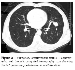 A 49-year-old man presented for medical treatment with a 30-year history of recurrent epistaxis, which had become less frequent in the last years. He also reported progressive fatigue and pallor over the last decade, together with progressive dyspnea, exacerbation of fatigue, pallor and weight loss of 6 kg over the preceding six months, as well as a family history of telangiectasias. He had no addictions and presented no hemoptysis or chest pain. In the physical examination, discolored mucosa, pallor, blood pressure of 110/70 mmHg and a 2/6 systolic ejection murmur were observed, together with telangiectasias in the oral mucosa, lips (Figure 1) and palate. The chest was clear to auscultation, and there was no digital clubbing. The blood workup performed at admission revealed the following: iron deficiency anemia with hemoglobin of 3.8 g/dL; mean corpuscular volume: 58.5 fL; red cell size distribution: 32.6%; and ferritin: 3.5 ng/mL. The results of red cell, folate and vitamin B12 tests, as well as those of a clotting screen, were normal. The test for occult blood in feces was positive. The chest X-ray showed a well-circumscribed nodule of 1.5 cm in diameter in the right lower lung lobe and a 1-cm nodule in the left middle lobe. These findings were consistent with pulmonary AVMs, which were confirmed through contrast-enhanced computed tomography scans of the chest (Figure 2). During complementary evaluation, endoscopy of the upper digestive tract indicated multiple gastric angiodysplasias (Figure 3). Echocardiography with agitated saline contrast medium was used to detect intracardiac or intrathoracic shunts. The echocardiogram revealed microbubbles in the left atrium within three cardiac cycles of their appearance in the right atrium, indicating intrapulmonary shunting. Cranial angiotomography, abdominal ultrasound and colonoscopy results were normal. A diagnosis of HHT was established. Two weeks of blood transfusions and iron therapy improved the anemia significantly, raising hemoglobin to 10 g/dL. After three months of outpatient evaluation, the patient remained symptom free.
