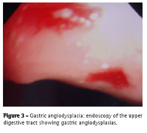 The clinical profile of HHT, a rare disease with a classic presentation, quite rarely includes severe anemia. Patients with HHT present normal hemostasis and platelet function, and the recurrent bleeding is therefore being related to the telangiectasias.(18) The anemia can be due to one or both of two factors: recurrent epistaxis and gastrointestinal bleeding.(6,19-20) In the previously mentioned 9 studies, the most common cause of severe anemia in patients with HHT was found to be chronic gastrointestinal bleeding (in 70%), followed by epistaxis (in 25%).(9-17)