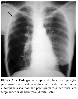 Paciente do sexo feminino, 60 anos, branca, em menopausa há 14 anos, é encaminha devido à presença de nódulo pulmonar à radiografia de tórax (Figura 1) diagnosticado no seguimento pós-operatório por neoplasia de mama. Trata-se de uma paciente que tem como antecedente pessoal a realização de mastectomia total à direita e linfadenectomia axilar ipsilateral há 3 anos por carcinoma ductal invasivo (diagnosticado por core biopsy) de 45 mm em seu maior eixo, grau nuclear II e estádio IIB (T2N1Mx). Submetida também à hormonioterapia (tamoxifeno 20 mg/dia) e quimioterapia (ciclofosfamida + metrotexate + 5-fluorouracil: quatro ciclos neoadjuvantes e seis ciclos adjuvantes), assim como a radioterapia adjuvante (dose total de 50 Grays por cinco semanas). Negava sintomas pulmonares, febre e emagrecimento.