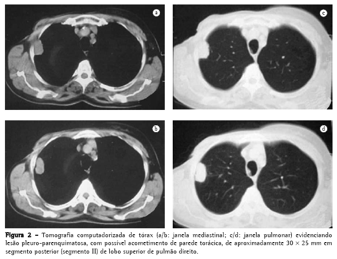 Foi então realizada tomografia computadorizada de tórax que identificou um nódulo pulmonar pleuro-parenquimatoso de aproximadamente 30 × 25 mm (Figura 2) em pulmão direito. Assim foi aventada a hipótese de metástase pulmonar do carcinoma de mama previamente operado, sendo indicada biópsia para confirmação diagnóstica.