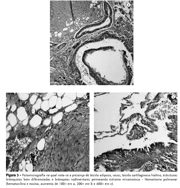 O exame anátomo-patológico revelou tratar-se de uma lesão de 30 × 25 mm, não encapsulada, regular e de consistência firme e fibroelástica. A microscopia (Figura 3) evidenciou vasos, tecido adiposo, tecido cartilaginoso, estruturas brônquicas bem diferenciadas, porém desorganizadas, e estroma fibrovascular ricamente vascularizado com brônquios rudimentares de permeio, compatível com hamartoma pulmonar.