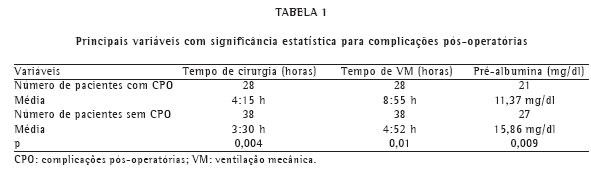 Neste estudo, o objetivo foi avaliar alguns índices nutricionais como pré-albumina e linfócitos, assim como o tempo de cirurgia e de VM, a fim de se identificar a influência destes fatores na morbidade pós-operatória.