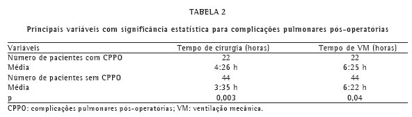 No que concerne aos dados pós-operatórios, foi colhido o tempo de VM (em horas), desde a intubação até a extubação no centro cirúrgico ou na unidade de terapia intensiva, e também foi realizada a análise das complicações pós-operatórias gerais e a sua subdivisão em complicações pós-operatórias específicas: CPPO (insuficiência respiratória aguda, atelectasia, derrame pleural, síndrome do desconforto respiratório agudo, pneumotórax, dispnéia); complicações infecciosas pós-operatórias (pneumonia, tuberculose, nódulo infeccioso); complicações cardiovasculares pós-operatórias (tromboembolismo pulmonar, cor pulmonale, arritmia).