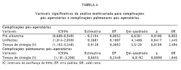 Vários estudos demonstram a relação entre CPO e baixo número de linfócitos. Para se complementar a avaliação em pacientes com suspeita de desnutrição protéico-calórica, devem-se determinar as proteínas séricas, como a pré-albumina, e avaliar o número de linfócitos.(21) Em relação ao presente estudo, a contagem de linfócitos não foi sensível o suficiente para predizer CPO, o que contradiz as publicações citadas. Já a pré-albumina se mostrou um índice nutricional preditivo de CPO, mas não de CPPO especificamente.