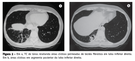 Paciente do sexo feminino, 39 anos, com história de pneumonia de repetição e episódios esporádicos de tosse produtiva e febre. Nos dois anos precedentes, a paciente apresentou quatro episódios de hemoptise de volume moderado. Na investigação pré-operatória, a TC de tórax evidenciou lesão no interior do bronco intermediário (Figura 1), bem como bronquiectasias císticas em lobo inferior direito (Figura 2). A fibrobroncoscopia confirmou o achado tomográfico de uma lesão endobrônquica vegetante, de coloração vinho, na emergência do brônquio intermediário, cuja biópsia da lesão revelou tumor carcinoide típico.